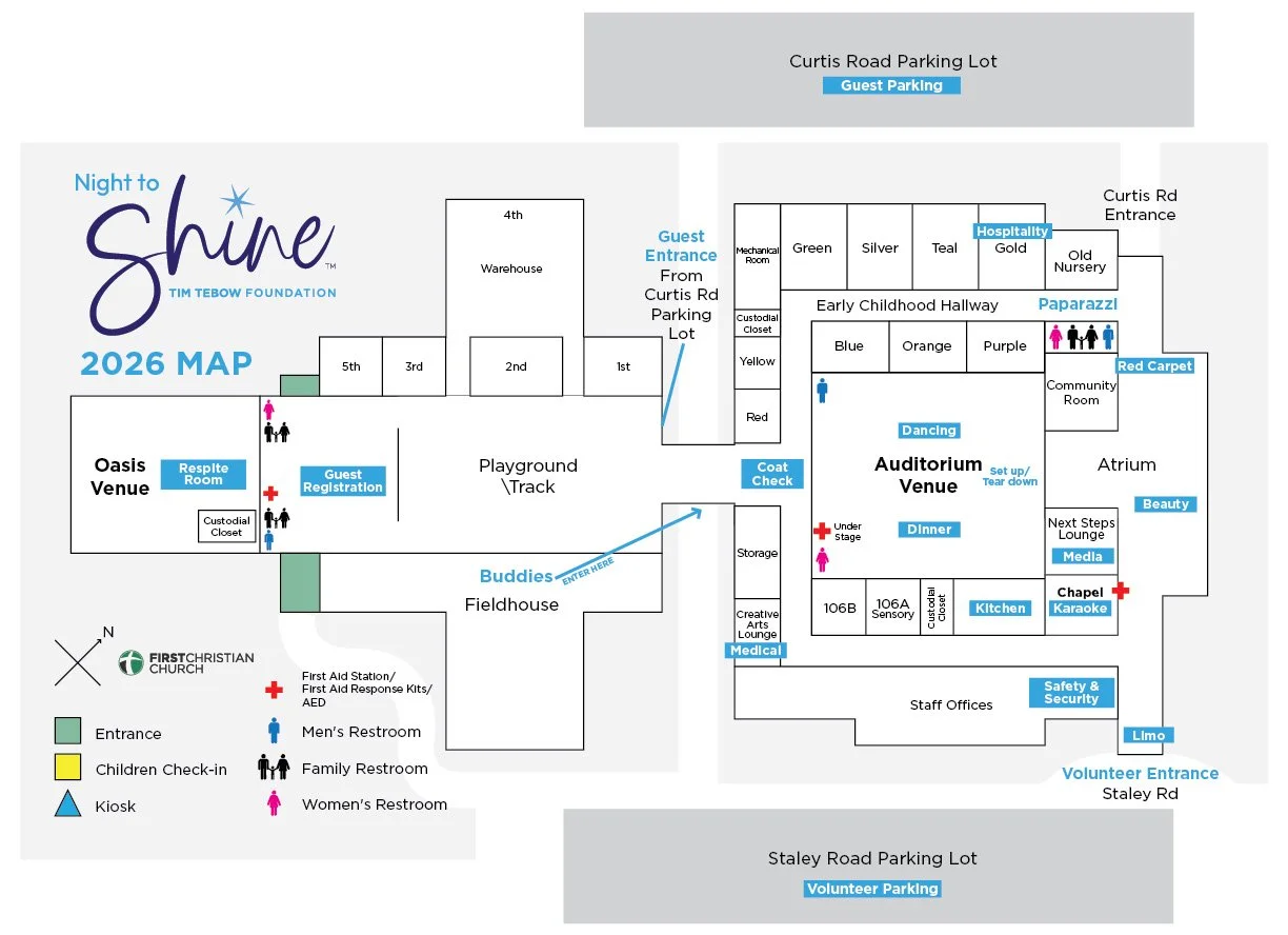 Monitor the main event space and outdoor areas, making sure ALL exits are not blocked and areas remain wheelchair accessible. One person from security team shall remain in the office at all times. Night to Shine is a closed event so everyone in the building should have a name tag. Do whatever Jared instructs!